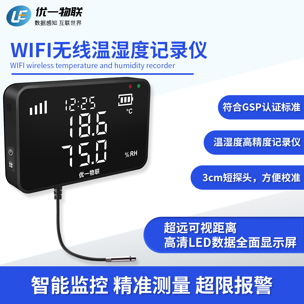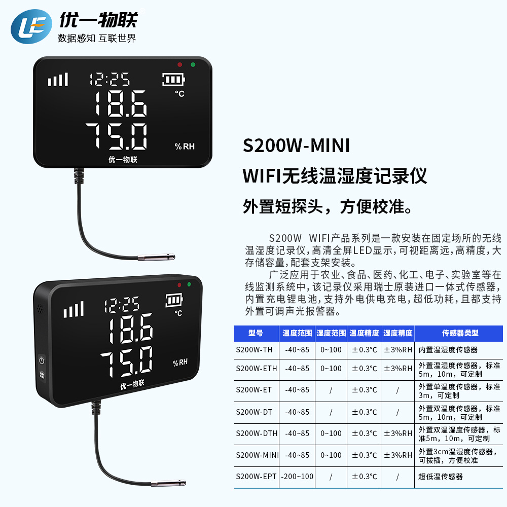 S200W WIFI產(chǎn)品系列是一款安裝在固定場(chǎng)所的無(wú)線溫濕度記錄儀,高清全屏LED顯示,可視距離遠(yuǎn),高精度,大存儲(chǔ)容量,配套支架安裝。 廣泛應(yīng)用于農(nóng)業(yè)、食品、醫(yī)藥、化工、電子、實(shí)驗(yàn)室等在線監(jiān)測(cè)系統(tǒng)中,該記錄儀采用瑞士原裝進(jìn)口一體式傳感器,內(nèi)置充電鋰電池,支持外電供電充電,超低功耗,且都支持外置可調(diào)聲光報(bào)警器。